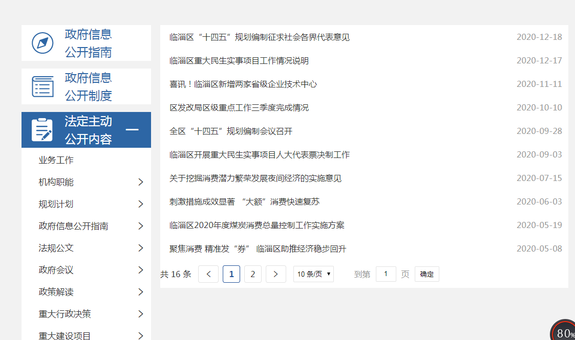 在临淄区门户网站设立临淄区发展和改革政府信息公开专栏,主动公布信息公开目录和信息公开指南等内容,结合发改工作实际,设置了“业务工作”“重大项目建设”“政策解读”“民生公益”“管理和服务公开”等栏目,按要求对外公开政府信息,做到及时维护和更新。