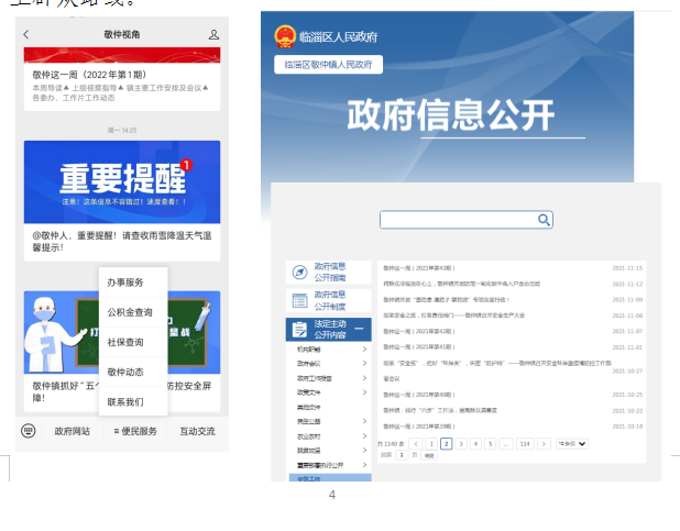 敬仲镇认真贯彻《中华人民共和国政府信息公开条例》和《临淄区人民政府办公室关于印发2021年临淄区政务公开工作要点的通知》要求,紧紧围绕全镇中心工作及群众关注关切,通过敬仲镇人民政府网站信息公开平台主动公开各类信息340余条;通过“敬仲视角”微信公众平台推送文章300余篇;撰写政务公开培训工作及相关信息18篇,及时向区政务公开办报送并在政府信息公开网站公开。