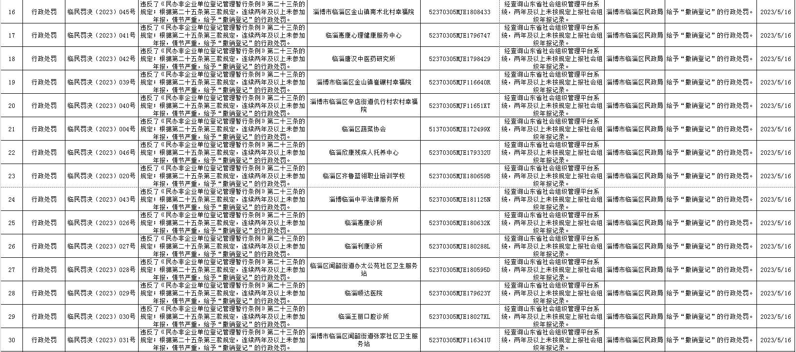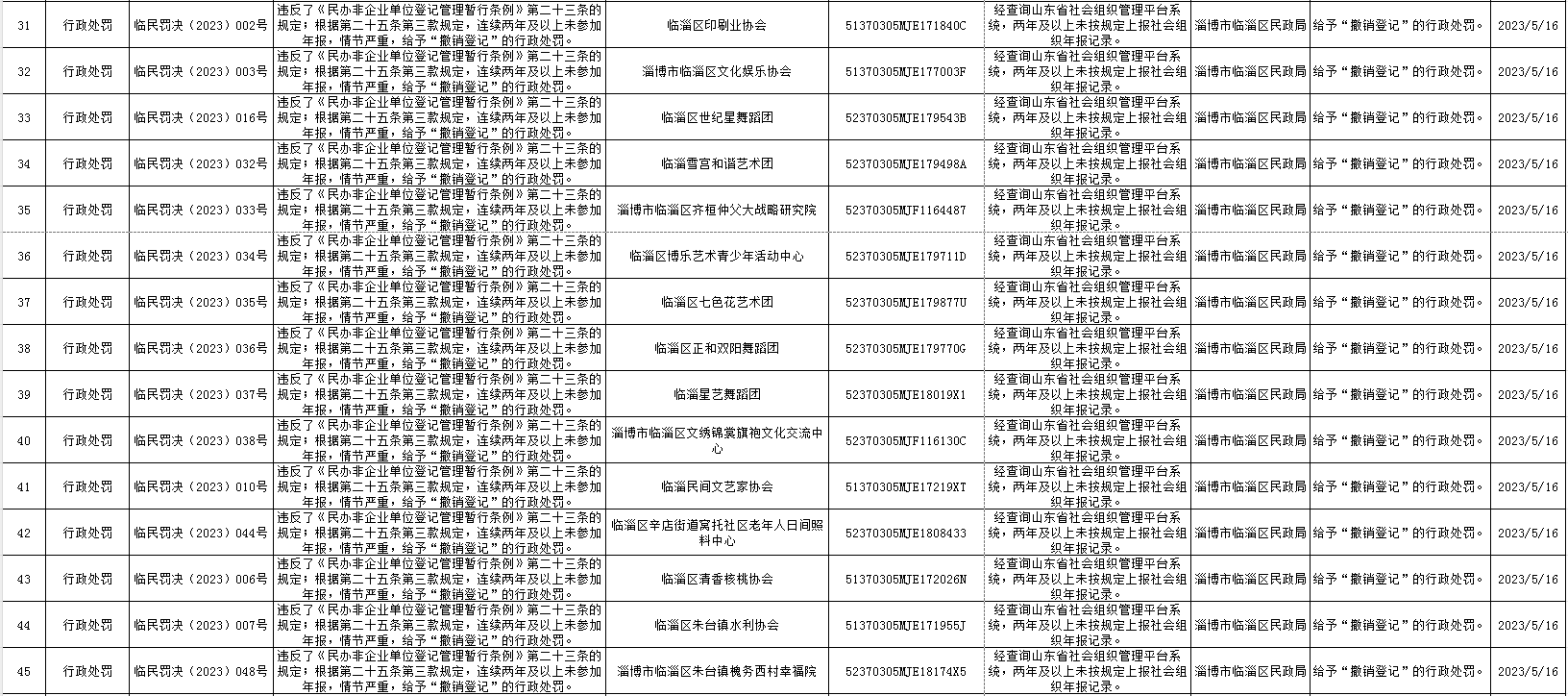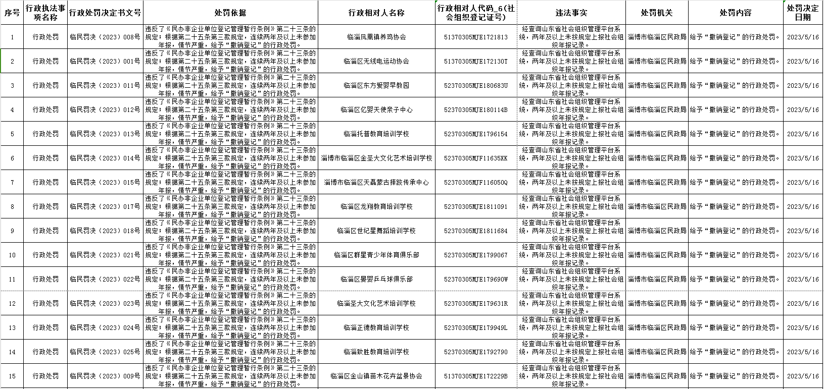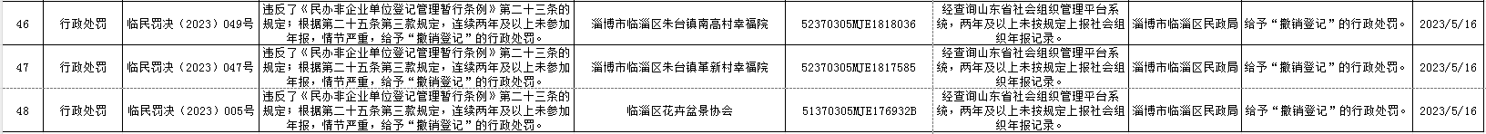 临淄区民政局2023年行政处罚信息公示
