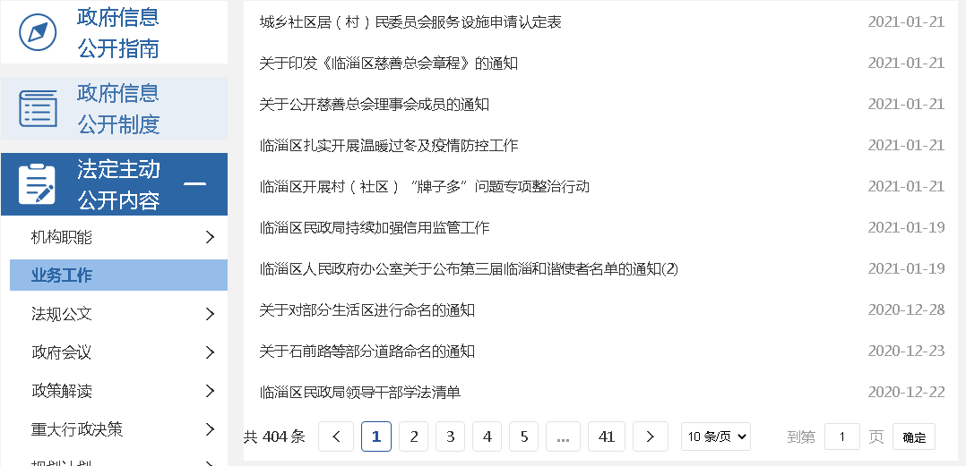 (五)平台建设。在临淄区门户网站设立临淄区民政局政府信息公开专栏,主动公布信息公开目录和信息公开指南等内容,结合民政工作实际,设置了“业务工作”、“民生公益”、“社会福利”、“社会救助”等栏目,按要求对外公开政府信息,做到及时维护和更新。