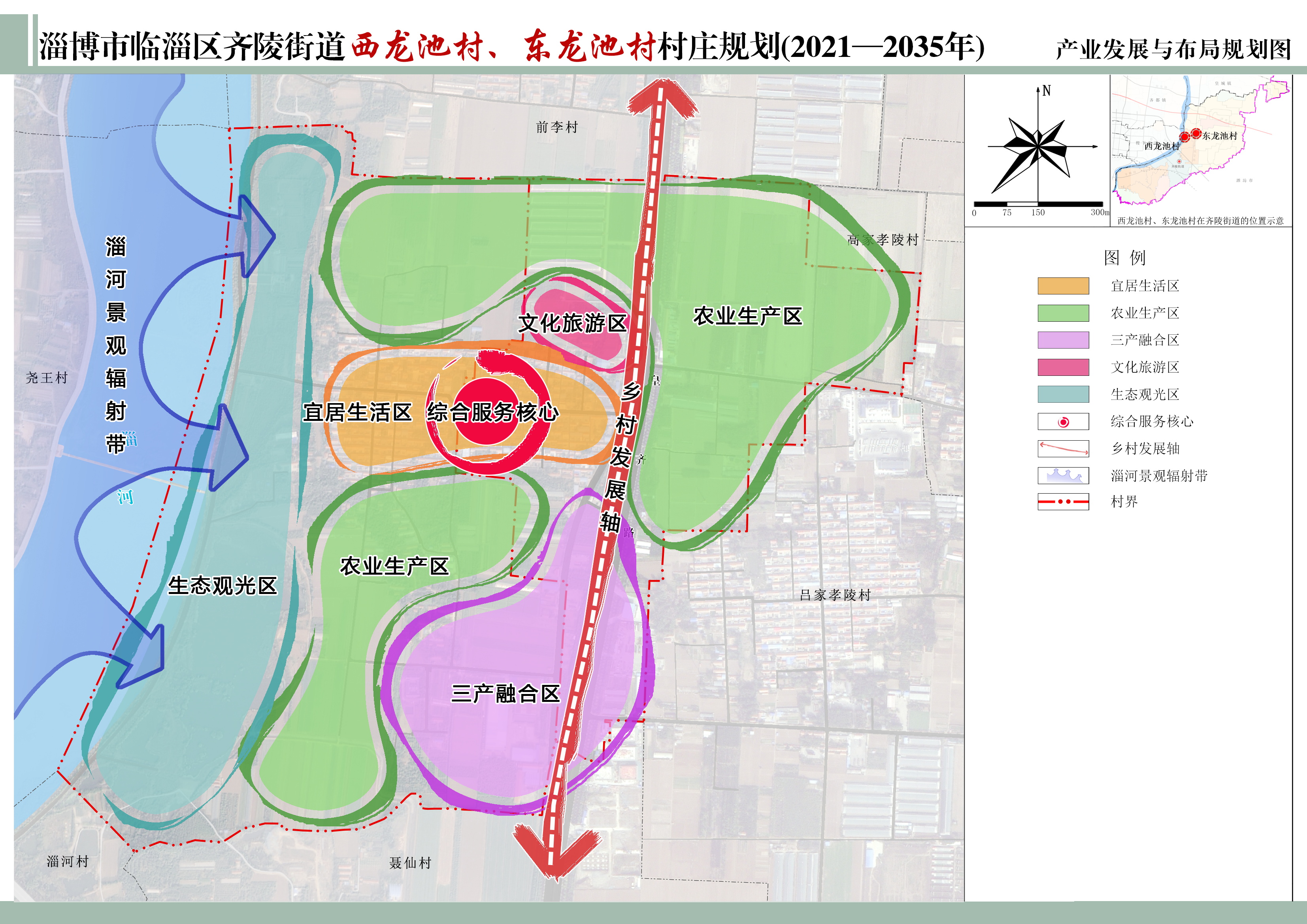 按照土地规划及产业发展策略,产业布局分五大功能区和三条精品游览路线,即:宜居生活区,农业生产区,三产融合区,文化旅游区,生态涵养区,滨河生态游线,特色文化游线,产业研学游线。
