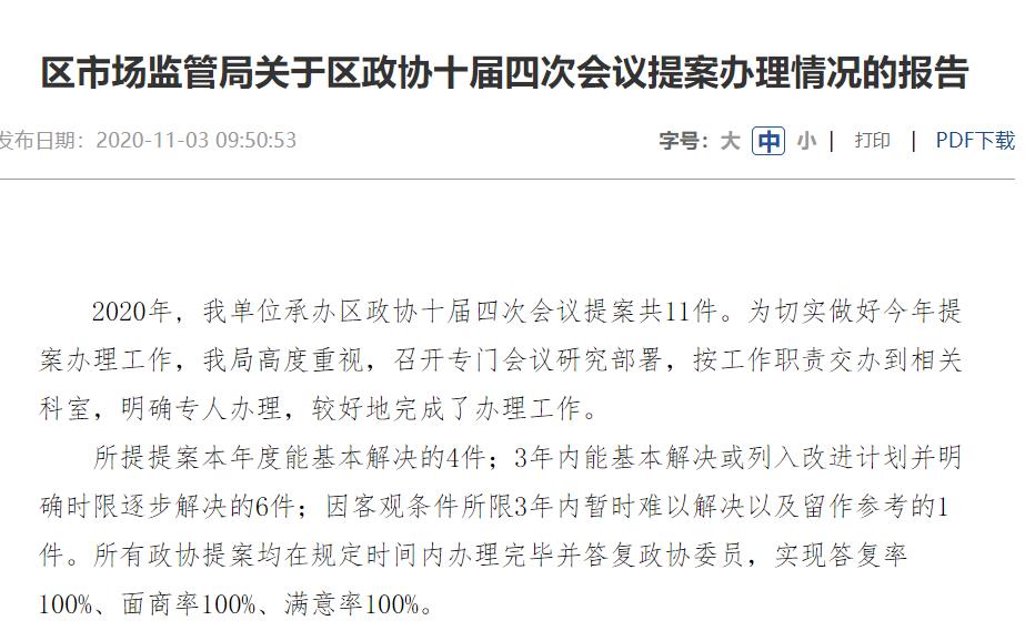 (三)建议提案办理公开情况。2020年区市场监管局共收到区十八届人大四次会议4号、14号、15号、17号4项建议,区政协十届四次会议7号、12号、20号、35号、36号、46号、58号、61号、98号、128号、143号11项提案。对收到的全部提案建议区市场监管局进行了认真办理,办结率100%、满意率100%,并及时公开办理情况报告,接受社会监督。