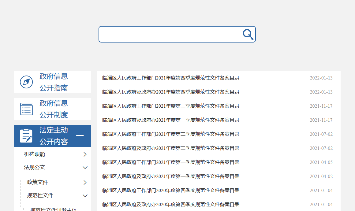 1.及时公开行政法规、规章和规范性文件。根据《政府信息公开条例》第二十条第(一)款要求,每季度公开了临淄区政府及政府办、政府工作部门行政规范性文件备案目录。