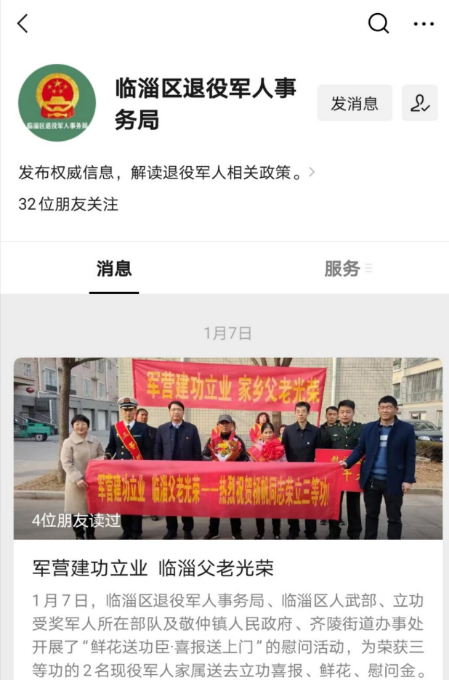 (四)政府信息公开平台建设情况。建立管业务就要管公开工作机制,按照谁主管、谁公开、谁负责原则,把信息公开各项任务分解落实到业务科室。丰富政府信息公开渠道,开通临淄区退役军人事务局微信公众号,制定信息发布审核机制,办公室归口平台建设、管理和维护,业务科室各负其责的工作机制,强化内容保障。