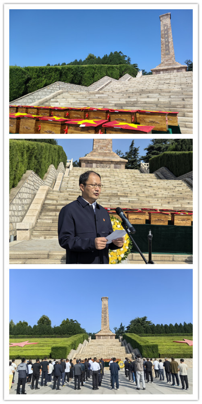 晴空朗朗,革命烈士纪念塔静静矗立。覆盖着国旗的烈士骨灰盒安放于塔前,现场奏响庄严的中华人民共和国国歌。临淄区退役军人事务局党组书记、局长王安东同志现场宣读祭文,深切缅怀烈士功绩。全体人员脱帽肃立,为英勇献身的革命先烈默哀一分钟。在深沉的哀思中,人们共同追忆那段烽火岁月,致敬用生命铸就和平的英雄。