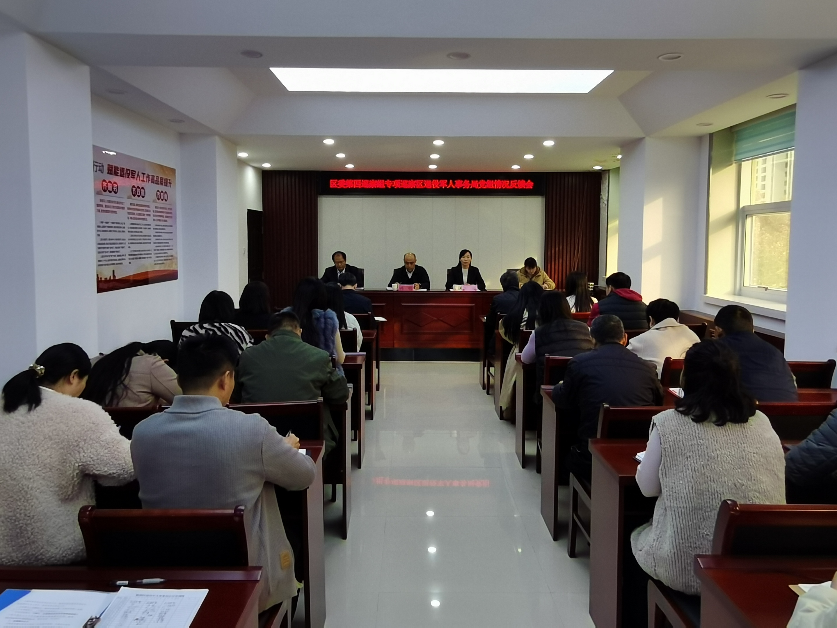 11月18日下午,区委第四巡察组巡察区退役军人局党组情况反馈会召开。区政府副区长、临淄公安分局局长韩明,区委第四巡察组组长李丽,区纪委监委派驻第二纪检监察组副组长王翠红出席会议,区退役军人局全体干部职工、离退休干部代表、部分退役军人参会,区退役军人局党组书记、局长王安东主持会议。