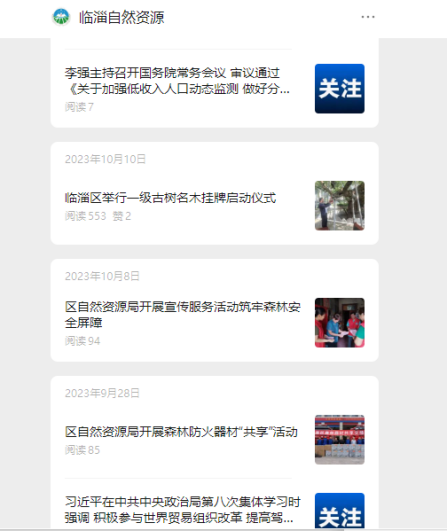 (四)政府信息公开平台建设情况。一是在临淄区政府网站设立临淄区自然资源局政府信息公开专栏,年内共发布信息1300余条;二是充分利用新媒体开展信息公开工作。截至2023年底,局微信公众号“临淄自然资源”关注人数1600余人,共发布317条内容,其中原创信息153条,原创视频6条,为用户提供最新的自然资源咨询、行业动态,宣传普及自然资源法律法规及政策解读、便民服务等内容,让群众了解、关注、支持自然资源管理工作。